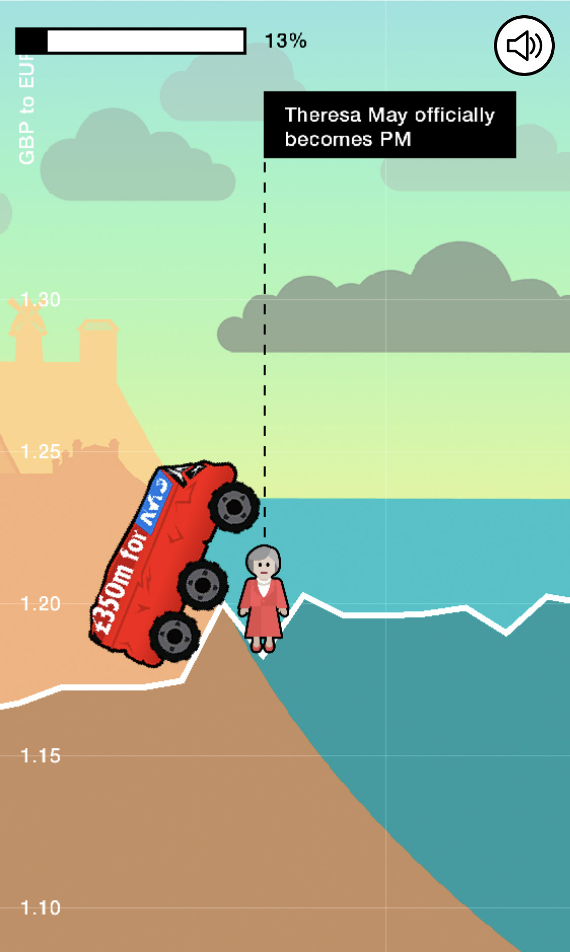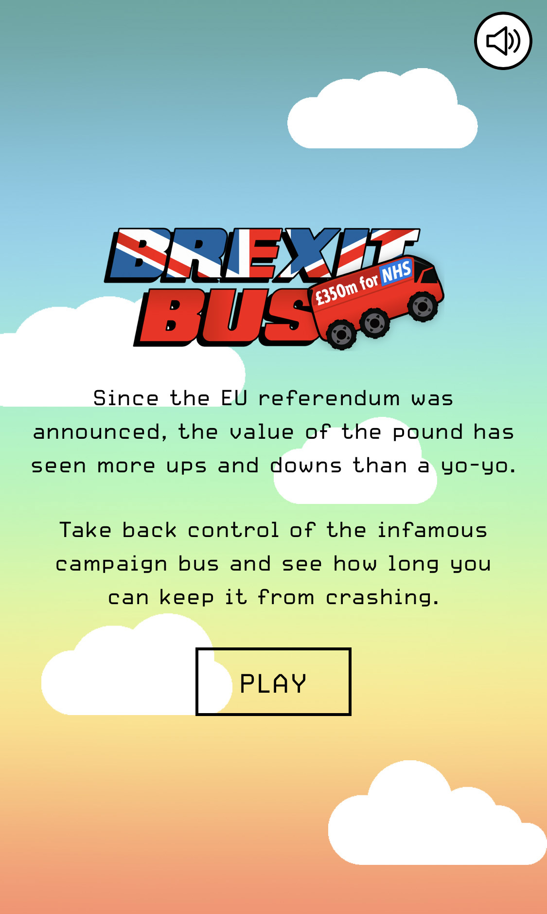 Since the EU referendum was announced, the value of Pound(£) has fluctuated dramatically. For this game, players are in the driver's seat of the Brexit bus. The bus visits several events in the campaign timeline which runs from May 2016 to November 2017. The main objective is to get the bus to run without crashing.