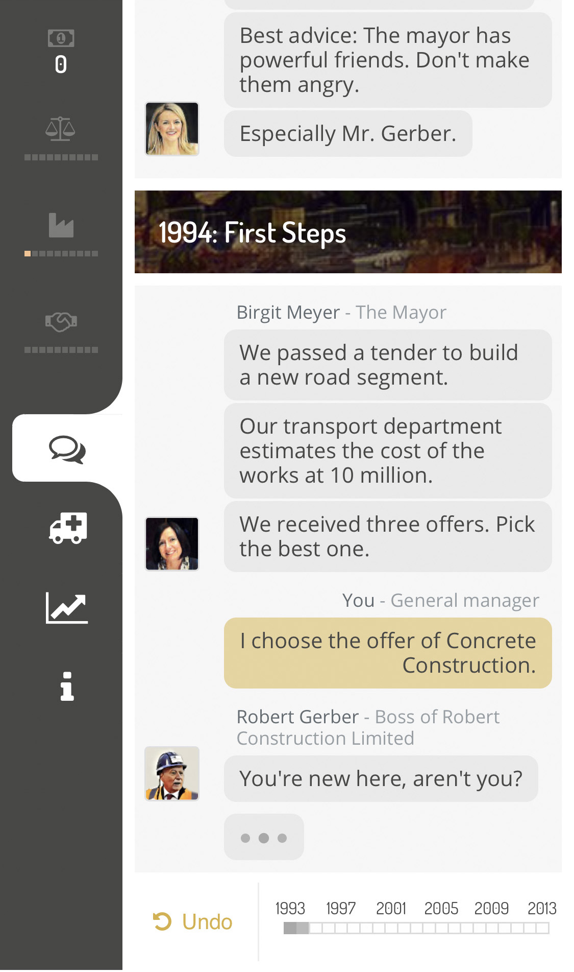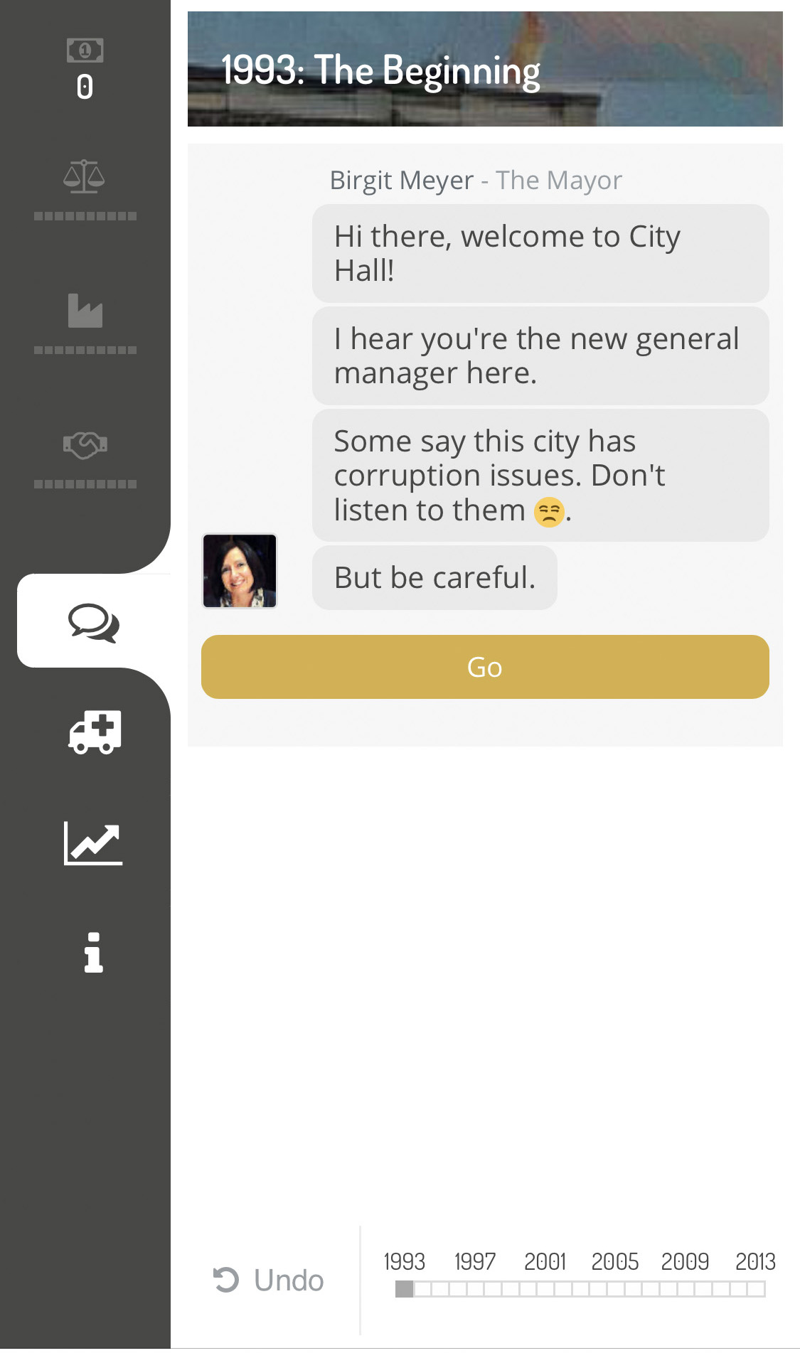 In The Good, The Bad and The Accountant players are asked to make decisions for the city's infrastructure spending that involves active or passive corruption. It is not necessarily true that all civil servants are corrupted, however, it raises awareness of pointing out that corruption is a systemic issue. The game has meters that measure the legal risk, industry mistrust and political rejection level based on the answers you provide. At times, refusing an offer that involves levels of corruption might lead to conflicts with stakeholders. In the hint tab, the game offers answers to questions such as "how do you organize bribe?" or "spotting corruption in land sales." Therefore, giving a thorough explanation to how these issues can be recognized. In sum, the game teaches players how to spot patterns of corruption.