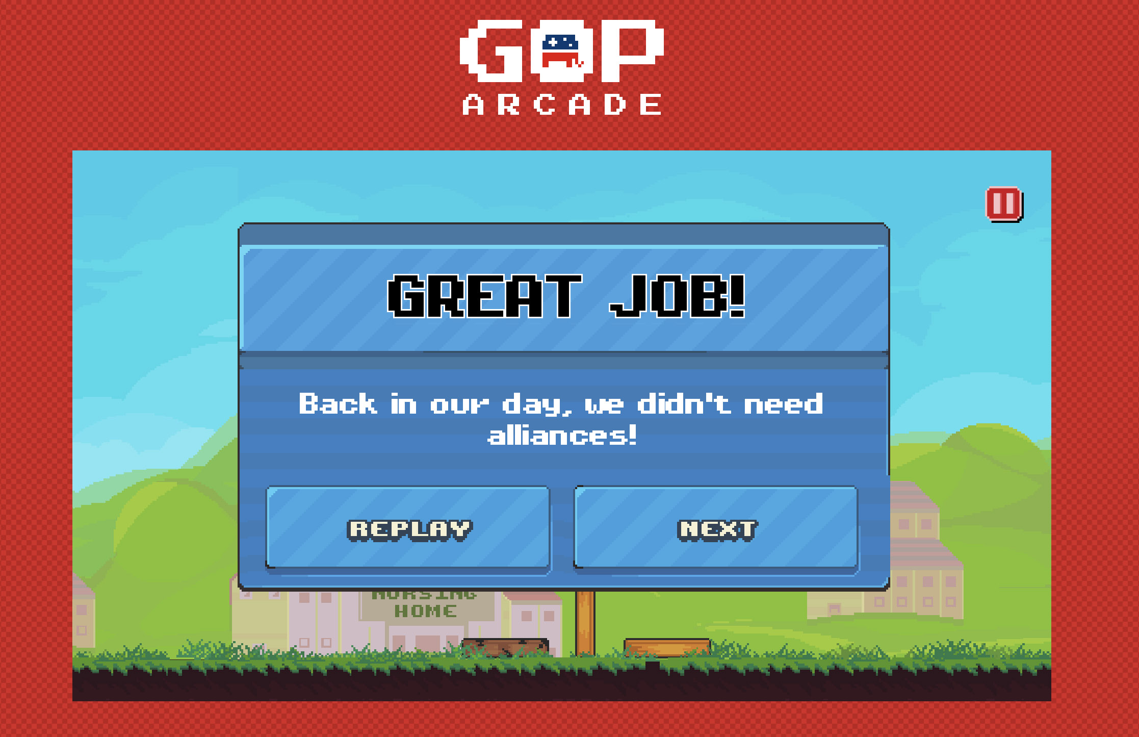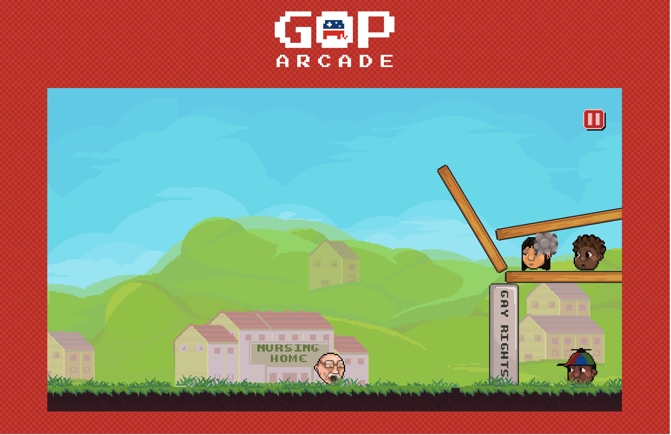 Like several other games created by GOP, Angry Olds has a satirical tone that reflects the American society. The game adopts the angry birds style format. Instead of overthrowing pigs, players are asked to launch grandpas from a slingshot with the world “VOTE” written along the side, into buildings made of blocks that says gay rights, civil rights, or healthcare...etc. Children are randomly placed on the blocks, and the goal is to make sure all children are cleared and diminished in each level. Once the level is cleared, the screen pops up sarcastic messages such as “back in our day, we didn’t need alliances” or “that’ll teach ‘em to hide behind social justice.”