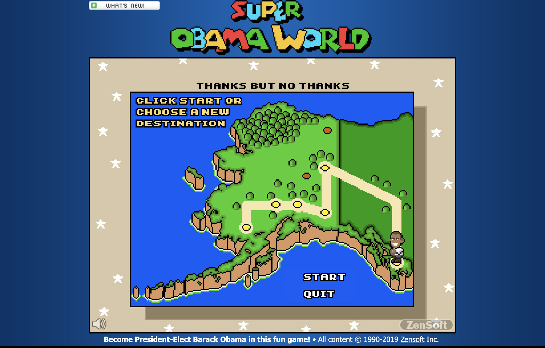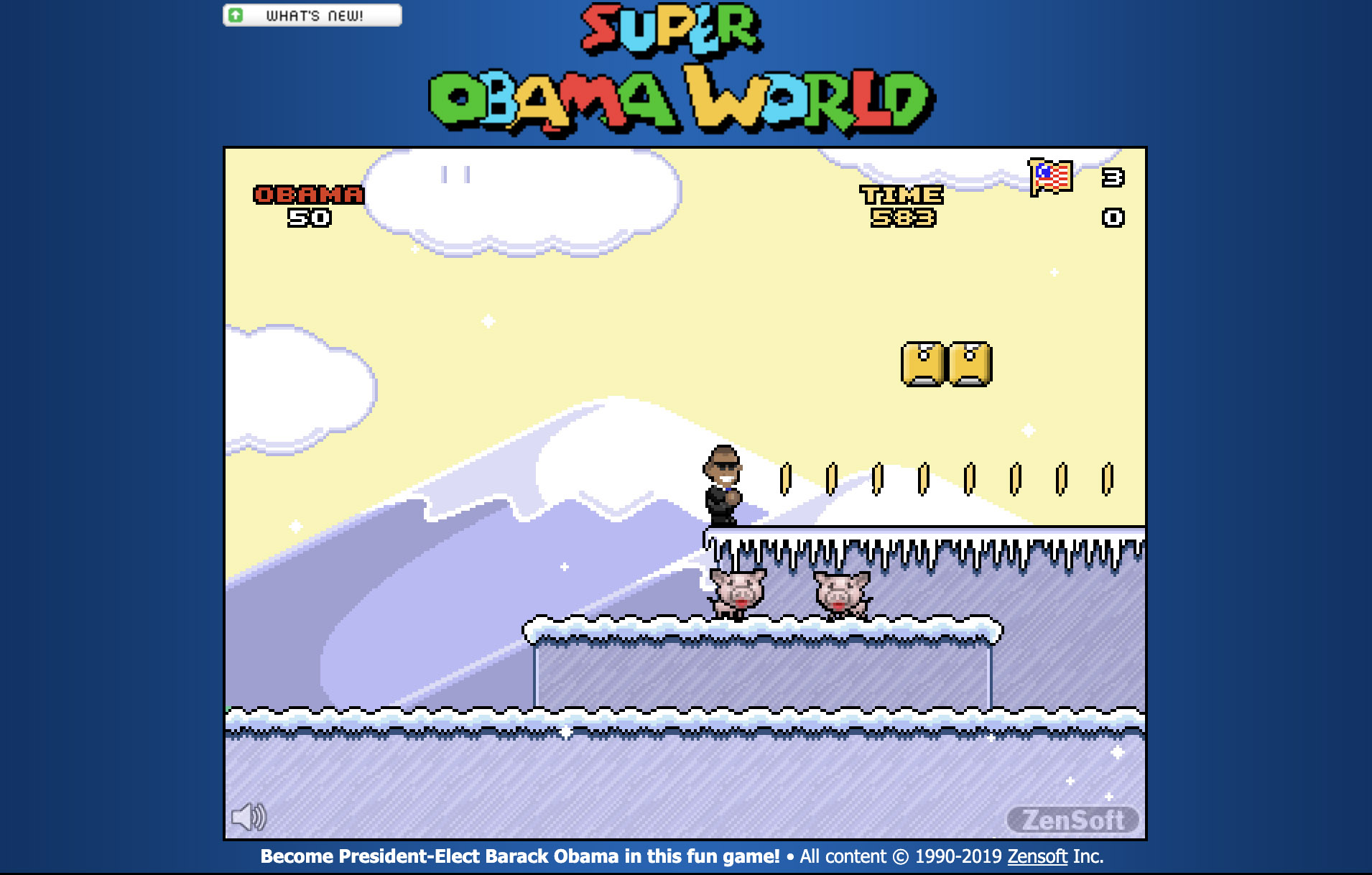Super Obama World uses the same game mechanics and aesthetics as Super Mario World as its design inspiration. In Super Obama World, Mario is replaced by Senator Obama, Goombas with corporate crooks and Koopas with politicking pigs. The game has 6 different levels and in each one it addresses a weak point of the McCain Campaign. In one, the player runs for an unnecessarily long road with a dead-end that says “nowhere Alaska” which aims to highlight the “bridge to nowhere” phrase that was much-used during the McCain campaign.