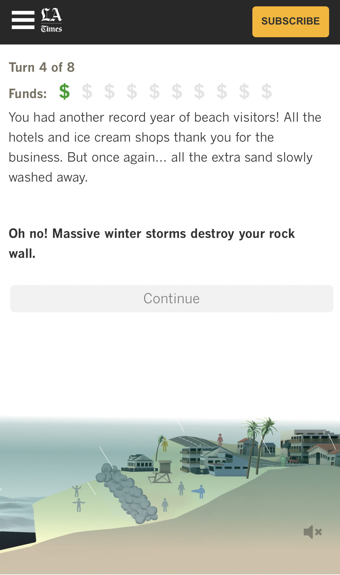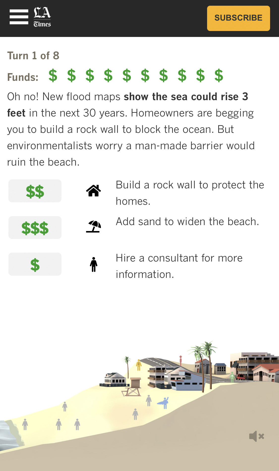 According to the effect of climate change, the coast of California will be deeply affected by the rising sea level. Beaches can vanish and flooding and erosion can threaten homes. However, there is still some time to set things right. The game puts players in charge. They are given 8 turns to save this beachside town through rising sea level adaptation. The game is based on interviews with coastal scientists, planning officials, homeowners, realtors, and environmentalists.