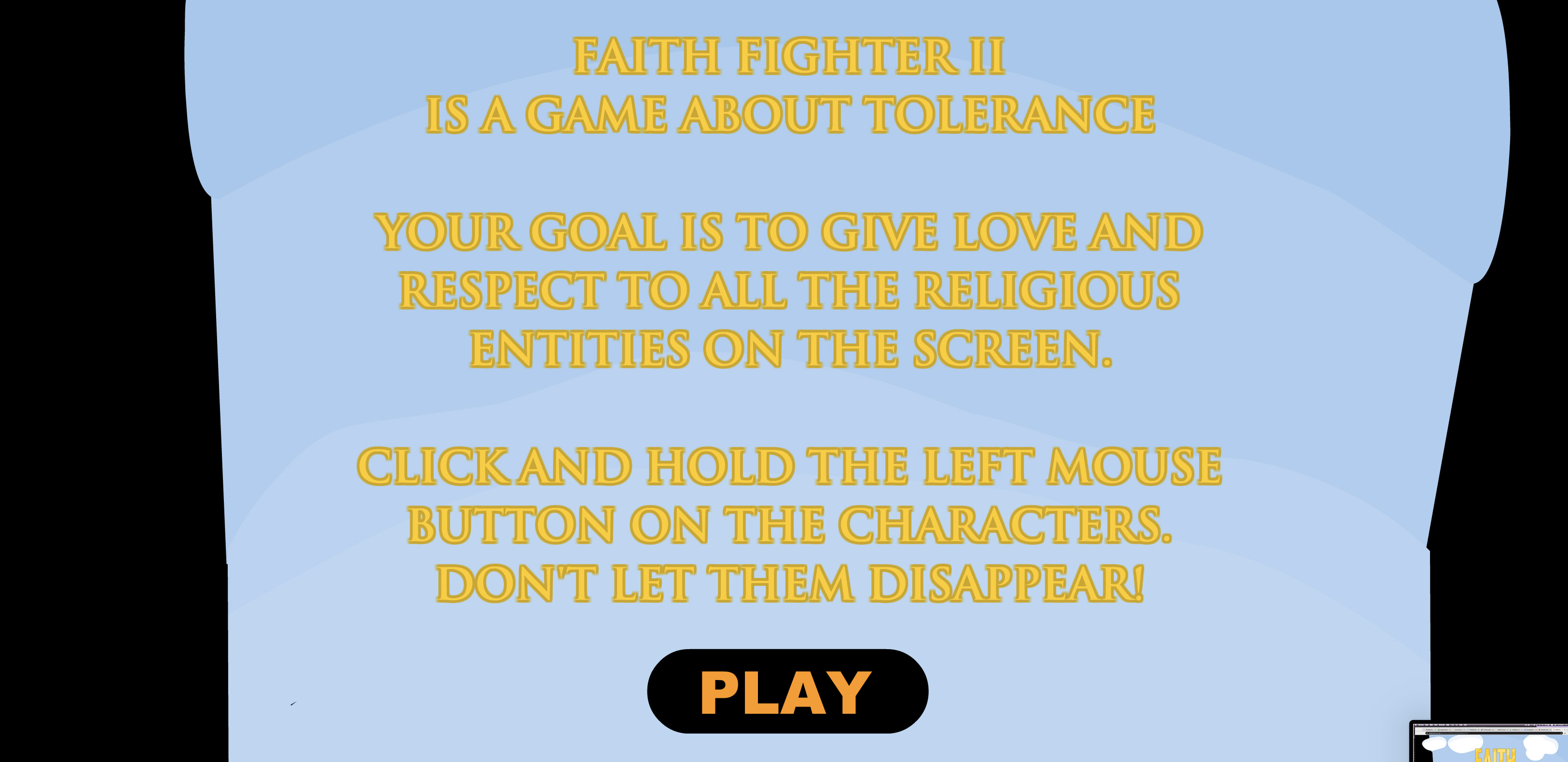 To further clarify the irony that is present in the original Faith Fighter game, Faith Fighter 2 is a game about loving all religions. The makers of the Faith Fighter stated their regrets on using irony to pin-point the hatred that circulates around the world regarding religion. Faith Fighter 2 aims to teach religious tolerance and respect.