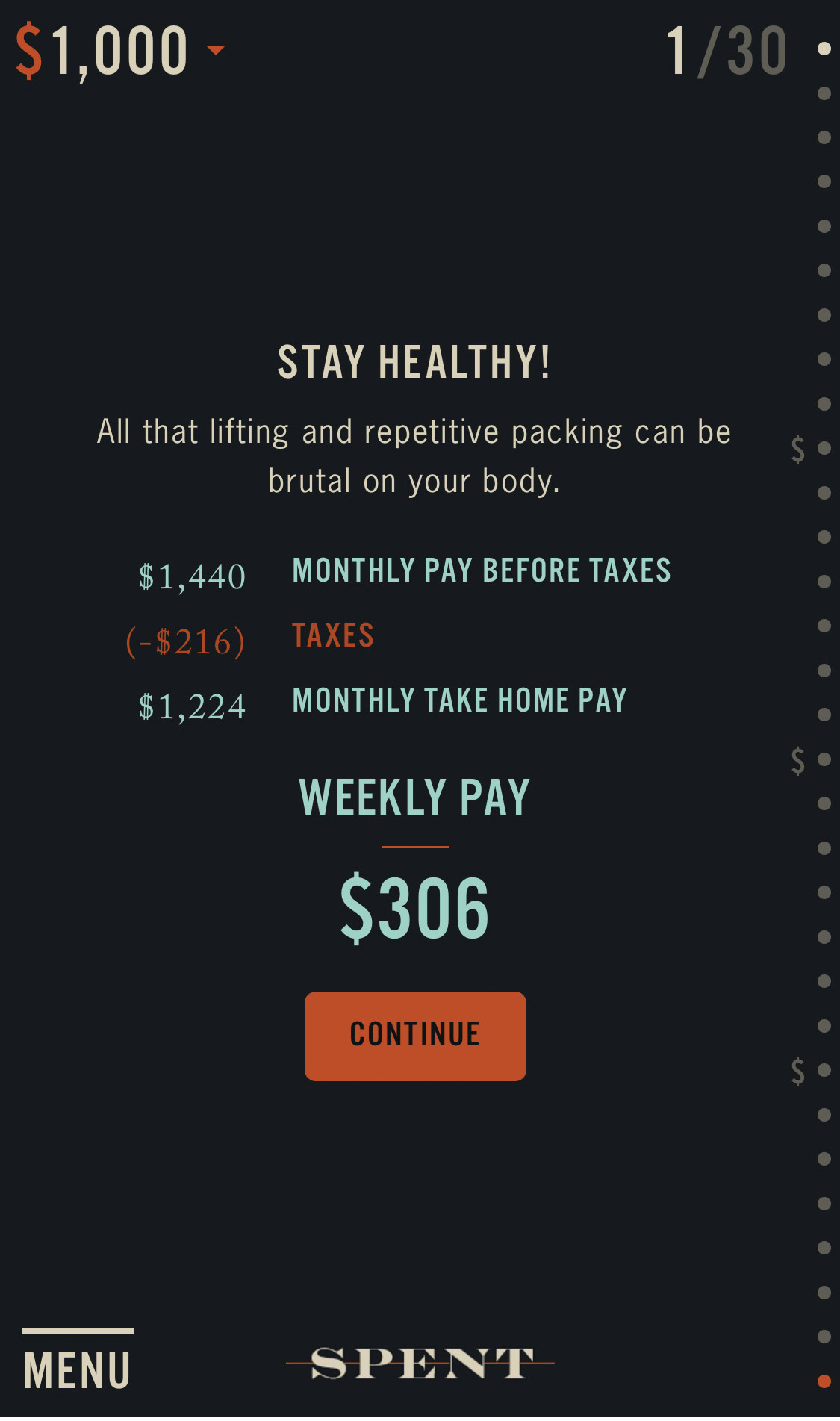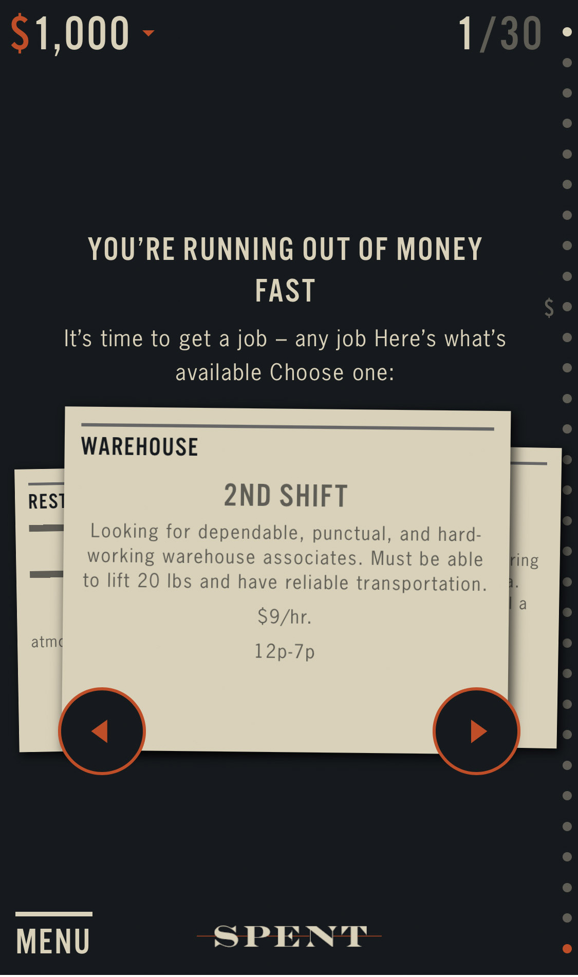 The game shows a monthly cycle of the low-income worker. We are asked to help him make decisions on his spending. Spending such as rent, car insurance, health insurance, and daily expenses, players are asked to make wise choices that will help him budget his spending while allowing some room for savings and remain employed. However, it is extremely difficult for a low-income worker to make ends meet. Once player has gone through the month, the game shows how much money is left is his bank account and reveals that rent is due the next day. The end of the game, there is a button that links to a donation page that gives players the opportunity to give $10 to those in need.